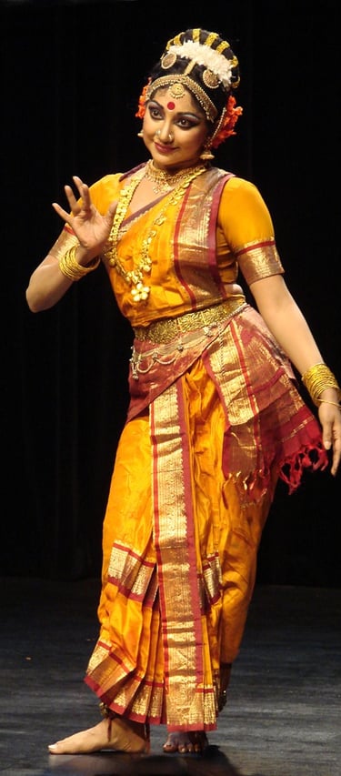 Originating from Tamil Nadu, known for its sculptural poses (often mimicking temple carvings), bent knees (Aramandi), and a combination of intricate rhythmic footwork (Nritta) and expressive facial and hand gestures (Abhinaya). It is one of the oldest forms